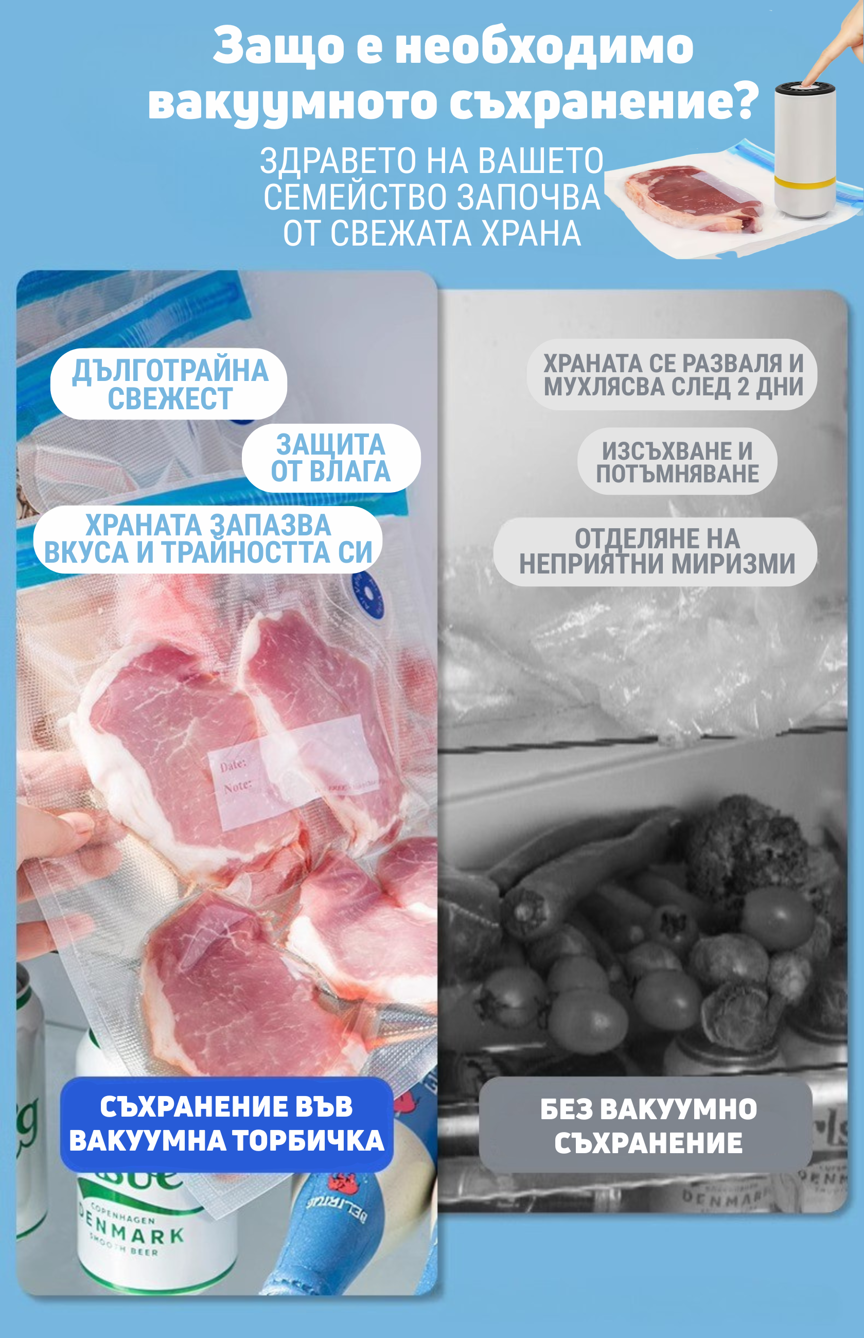 Вакуумирането свива обема на опаковките до минимум, позволявайки ви да подредите до 3 пъти повече продукти. Идеално решение за малки фризери и перфектна видимост на хранителните запаси.
