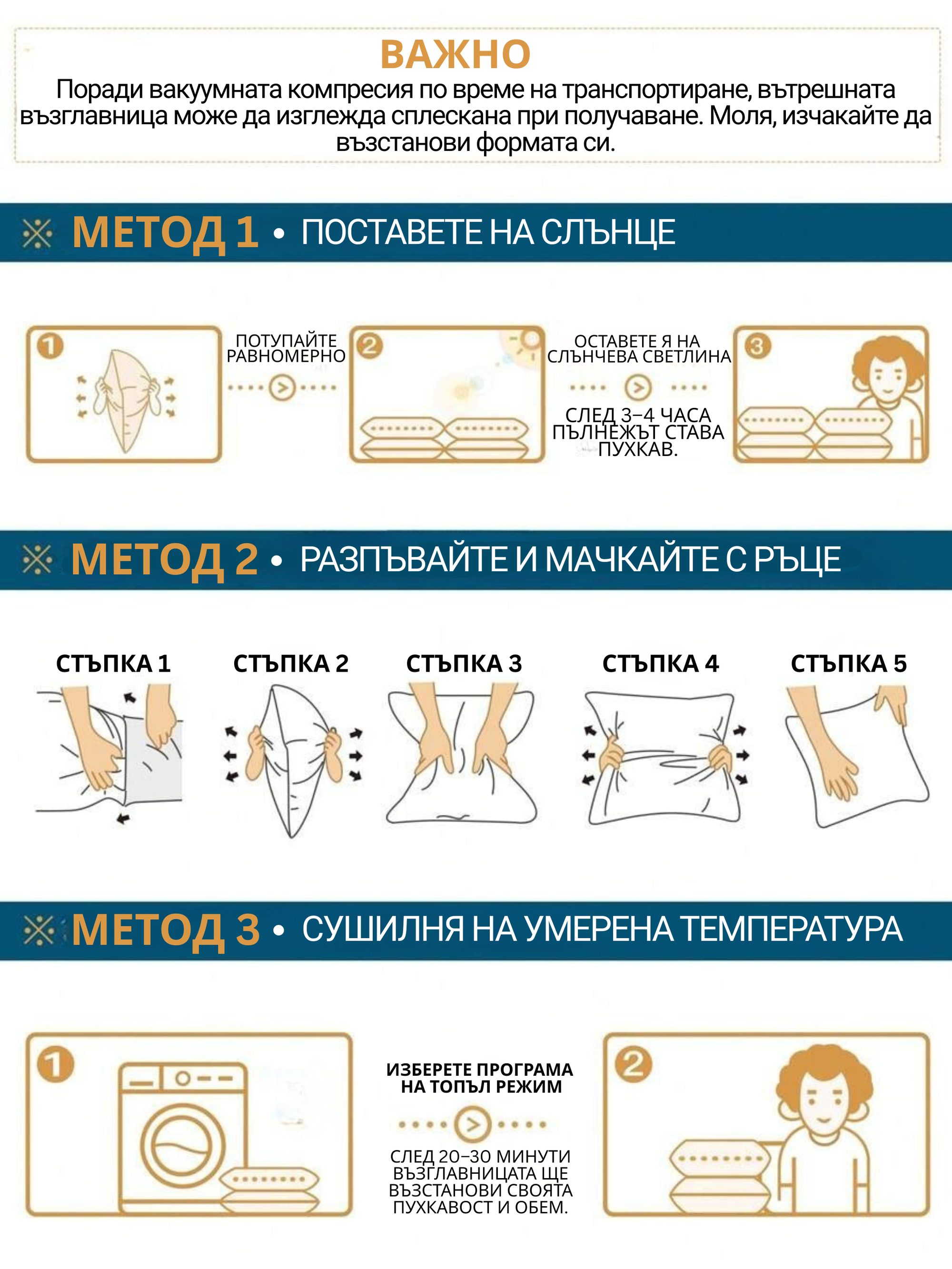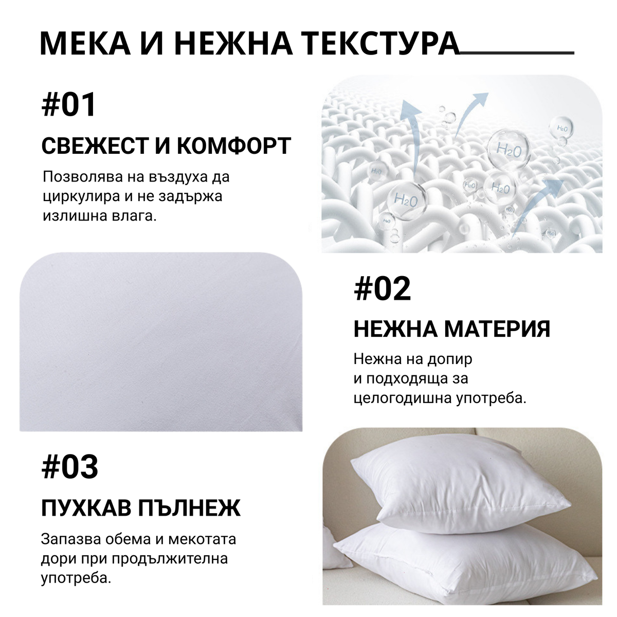 След притискане възглавницата възвръща обема си бързо, като запазва мекотата и структурата си дори при ежедневна употреба.